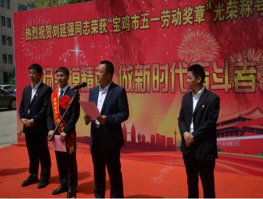 4月30日,寶雞市勞動者之歌暨慶?!拔逡弧眹H勞動節(jié)大會勝利召開,公司劉延強同志被授予“寶雞市五一勞動獎章”光榮稱號,公司在總部辦公樓前舉行了簡樸隆重的歡迎儀式。公司副董事長、總經(jīng)理胥立,黨委書記景旭東,工會主席王建成等出席儀式,總部全體、寶雞文化藝術中心項目部管理人員參加。