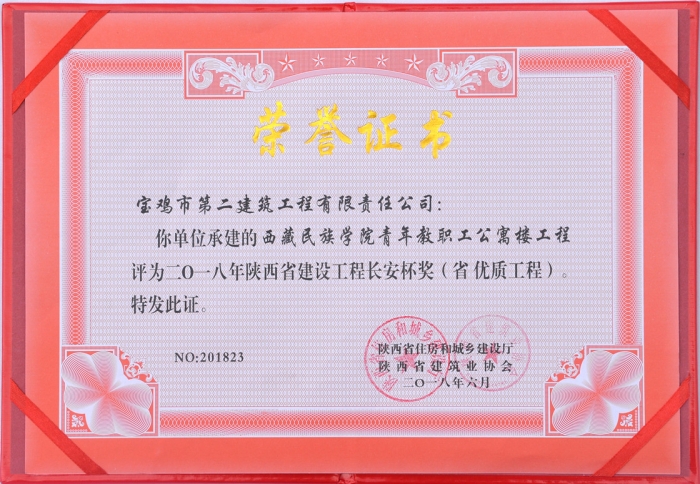 長安杯獎(jiǎng)是陜西省住房和城鄉(xiāng)建設(shè)廳評選、頒發(fā)的本省建設(shè)工程質(zhì)量最高榮譽(yù)獎(jiǎng)。西藏民族學(xué)院青年職工公寓樓工程是西藏民族學(xué)院(現(xiàn)更名西藏民族大學(xué))確定的重點(diǎn)建設(shè)工程項(xiàng)目,也是公司推行內(nèi)部模擬股份制架構(gòu)下精細(xì)化管理模式試點(diǎn)項(xiàng)目。在建設(shè)初期,公司總部精心策劃,全力部署,公司領(lǐng)導(dǎo)多次蒞臨施工現(xiàn)場檢查指導(dǎo)工作。公司副總經(jīng)理兼項(xiàng)目經(jīng)理曾永祥精心組織,細(xì)化分工,責(zé)任到人,嚴(yán)格要求項(xiàng)目部全體管理人員,并堅(jiān)持以身作則,帶領(lǐng)整個(gè)團(tuán)隊(duì),戰(zhàn)高溫、抗嚴(yán)寒、抓質(zhì)量、搶進(jìn)度,最終完成了這項(xiàng)經(jīng)得起各方檢驗(yàn)的優(yōu)質(zhì)工程,為業(yè)主和社會交上了一份滿意的答卷。
