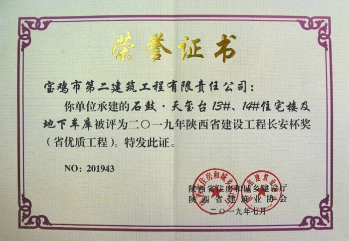 11月12日,陜西省住建廳組織在西咸新區(qū)灃西新城西部科技創(chuàng)新港舉行頒獎(jiǎng)儀式,由公司第三十四項(xiàng)目部承建的石鼓·天璽臺(tái)13#、14#住宅樓及地下車(chē)庫(kù)工程和第三十五項(xiàng)目部承建的西安高新綜合保稅區(qū)保稅倉(cāng)庫(kù)一期項(xiàng)目雙獲2019年陜西省建設(shè)工程“長(zhǎng)安杯”,這是公司獲得的第20、21項(xiàng)“長(zhǎng)安杯”。