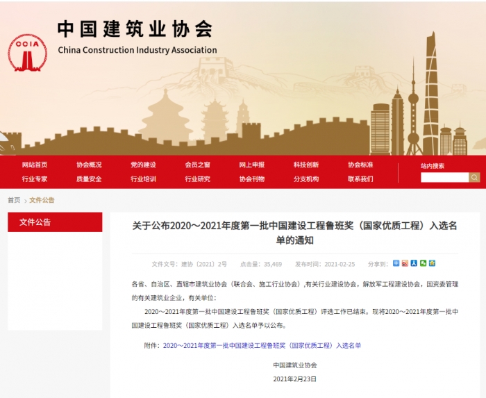 2月23日,中國建筑業(yè)協(xié)會公布了2020~2021年度第一批中國建設(shè)工程魯班獎(國家優(yōu)質(zhì)工程)入選名單。